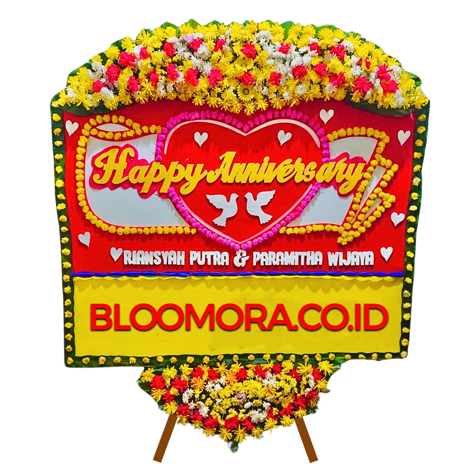 Karangan bunga papan ukuran panjang 2×1,5 meter dengan  bunga segar dikombinasikan dengan suyok. Papan terbuat dari styrofoam dan busa