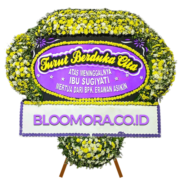 Karangan bunga papan ukuran panjang 2×1,5 meter dengan  bunga segar dikombinasikan dengan suyok. Papan terbuat dari styrofoam dan busa